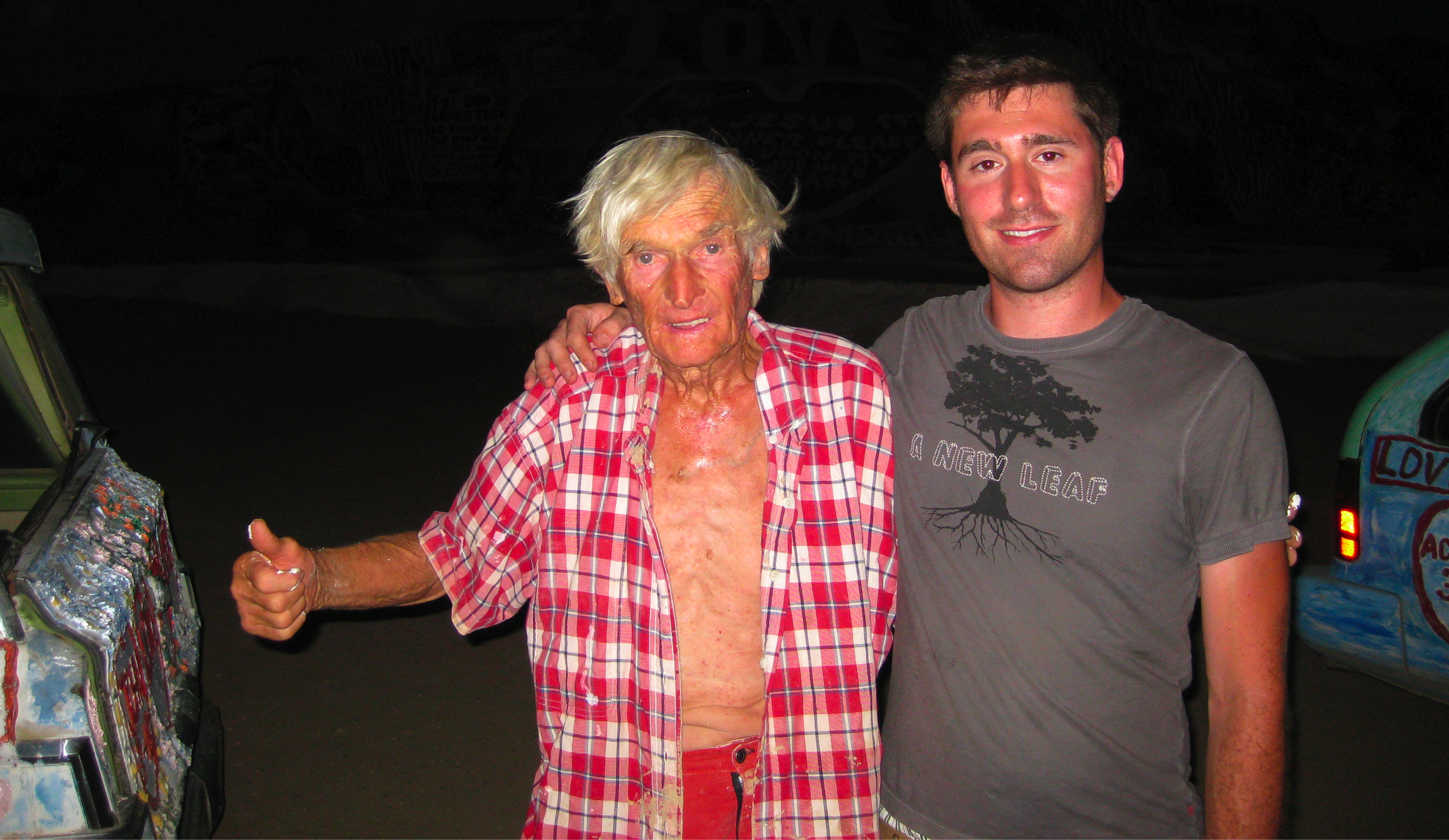 Today we visited Slab City and Salvation Mountain. We got there kind of late, but Leonard came out to greet us and give us a tour of Salvation Mountain. We are sleeping near this incredible sight tonight and will go back to see the mountain during the day. We plan on interviewing Leonard to hear his opinion about equal rights for gays and lesbians. Leonard’s whole message, the mountains he has spent 24 years creating, is that God is Love. I’m interested to hear what he has to say about gay love and the bible.