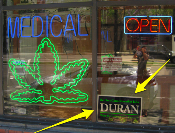 This is a medical marijuana shop. Check out the sign in the widow! It is a campaign sign for the Mayor, John Duran, who we interviewed earlier.