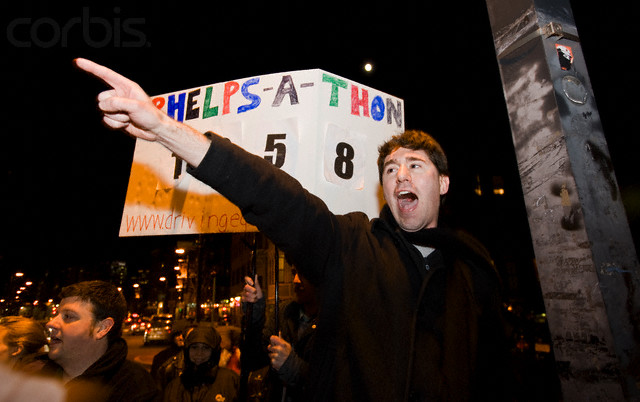 12 Dec 2008, Boston, Massachusetts, USA — Christopher Mason of Driving Equality leads a counter-protest of 300 people against the anti-gay protest group from the Westboro Baptist Church from Topeka, Kansas. The church group was protesting against a performance at the Boston Center for the Arts. — Image by © Rick Friedman/Corbis
